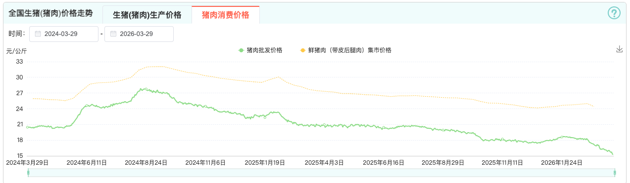 猪肉批发价格下降背后,是生猪价格的持续低迷。农业农村部监测信息显示,2026年3月第3周,全国30个监测省份生猪价格全部下跌,生猪平均价格为每公斤11.05元,同比下跌28%,创2018年6月以来新低。