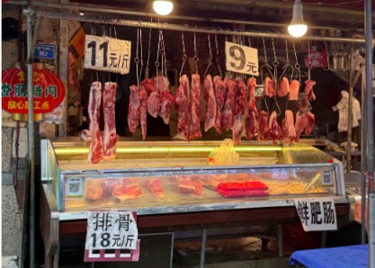 一家永辉超市也打出“优质平价五花肉”,价格为11.9元/斤;鲜猪汤骨7.9元/斤、鲜猪后蹄髈8.9元/斤。消费者于女士在现场对红星资本局感叹道:“猪肉价格真是越来越便宜了。”