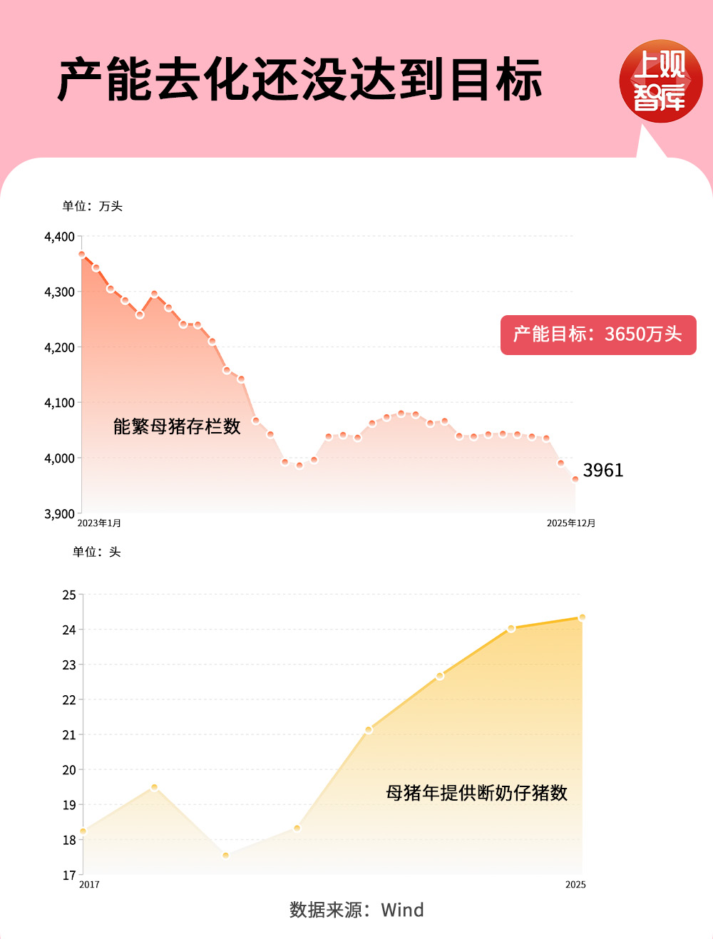 值得注意的是,单纯看母猪数量已不足以反映真实供给,行业生产效率改变。数据显示,行业PSY(每头母猪年提供断奶仔猪数)已从2017年的17.38头提升至2025年的24.34头。同等能繁母猪存栏下,实际仔猪产出增加造成隐形的产能,进一步延长去化周期。