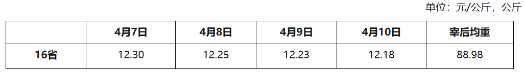 4月13日电中国农业农村信息网13日发布2026年第15周瘦肉型白条猪肉出厂价格监测周报显示,据农业农村部信息中心和山东卓创资讯股份有限公司联合监测,2026年第15周(即2026年4月7日-4月10日,以下简称本周),16省(直辖市)瘦肉型白条猪肉出厂价格总指数的周平均值为每公斤12.24元,环比下跌3.9%,同比下跌35.9%,较上周跌幅扩大2.0个百分点。