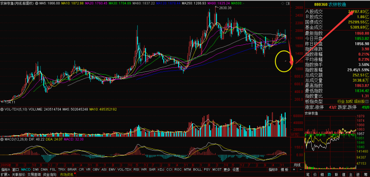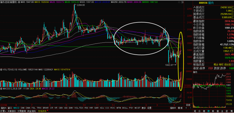 就“猪肉指数”短线而言,今天的中阳线,成交数量放大、成交金额缩小,且成交数量远高于前期套牢盘区域。这个细节表明猪肉股的筹码进一步分散化,加之120天线交叉250天线因素,基本上宣告猪肉板块反弹反抽行情到此为止。