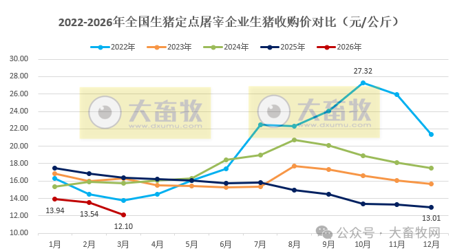 在2022-2026年这5年同期相比,2026年1-3月生猪收购价格低于前4年同期。