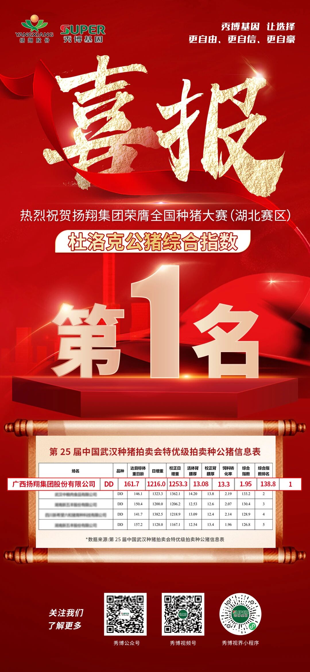 扬翔杜洛克种公猪拔得头筹,不仅是扬翔集团的荣誉,更是中国生猪种业自主可控的有力见证。未来,扬翔秀博将继续秉承“科技驱动,基因引领,智造未来”的战略理念,助力中国养猪业高质量发展。