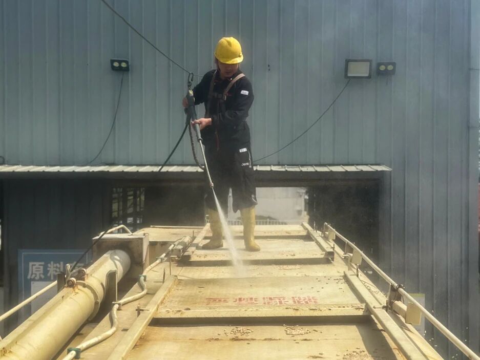 早上八点,泗洪德康车辆洗消中心的大门缓缓打开,晨光洒进作业区。庞大的饲料车静静停驻,轮廓在光线下显得格外沉稳,空气中飘散着消毒水的清冽气味。庄新建早已穿戴整齐——深蓝色防水工装、及膝胶靴和一双磨得发白的橡胶手套。他走到洗车区,弯腰拾起那盘沉甸甸的高压水管,动作熟练得像每天重复的仪式。