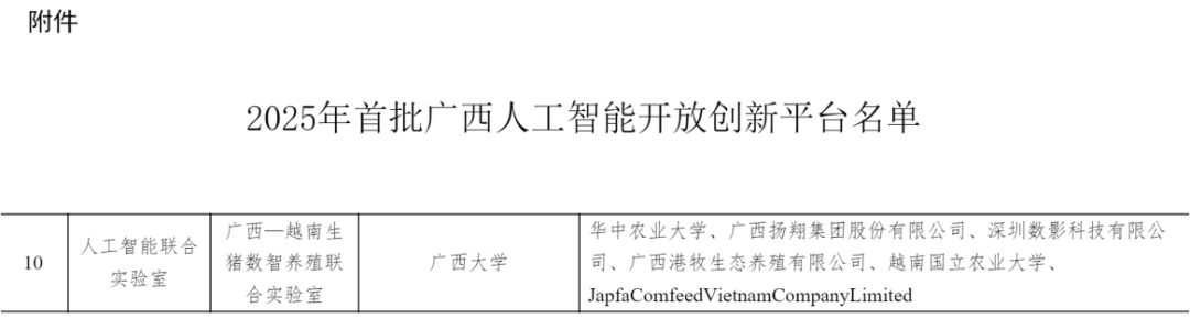 近日,广西科学技术厅公布2025年首批广西人工智能开放创新平台名单,共包含13个人工智能开放创新平台。由广西大学牵头,扬翔集团等作为核心共建单位参与建设的“广西-越南生猪数智养殖联合实验室”成功入选“人工智能联合实验室”,成为该平台的重要成员单位。