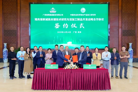 11月14日,扬翔集团旗下广西贵港市盈康食品有限公司与中国农业科学院农产品加工研究所在集团总部正式签订合作协议。此次合作以“共筑创新平台,引领肉品未来”为核心愿景,聚焦生猪肉提质保鲜、深加工制品开发及现有产品升级三大核心方向,将以科技赋能创新,驱动猪肉深加工产业链全面升级。中国农科院农产品加工研究所专家团队,以及扬翔集团总裁施亮等领导出席并见证了这一重要时刻。