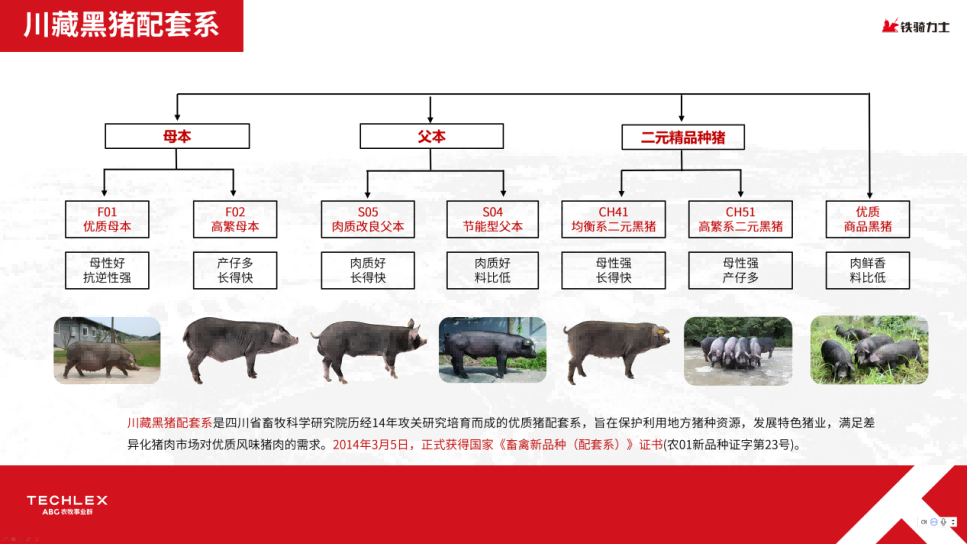 目前,铁骑力士拥有一个川藏黑猪省级核心育种场及一个万头父母代场,计划再建一个2400头核心育种场,现种猪存栏1万头,年出栏可达23万头。