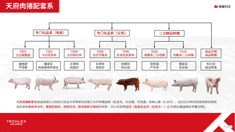 为了适应多变的市场需求,铁骑力士重点围绕“高产、节粮、肉质”三个方向,在天府肉猪配套系的基础上,实施了专门化品系的选育,培育具有天府肉猪特色的新种猪配套系,致力于打造高产、高繁殖力的品牌种猪。