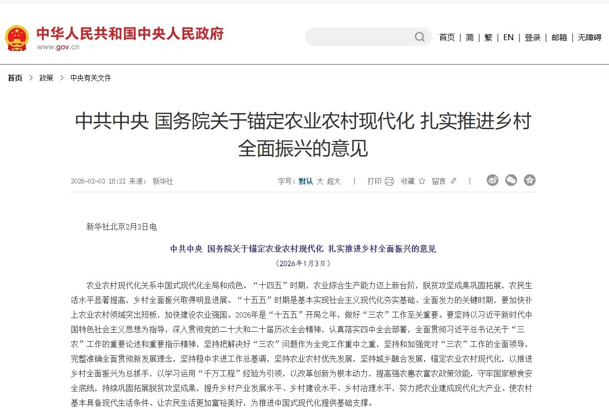 2月3日,2026年中央一号文件《中共中央国务院关于锚定农业农村现代化扎实推进乡村全面振兴的意见》重磅公布。这份“十五五”开局之年的三农工作纲领,以前所未有的力度确立了智慧农业在农业农村现代化进程中的核心战略地位,为行业高质量发展划定清晰路径。