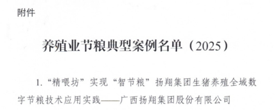 近日,全国畜牧总站正式发布首批养殖业节粮典型案例,扬翔集团的“精喂坊”生猪养殖全域数字节粮技术应用实践成功入选,成为生猪养殖领域唯一获此推介的案例。
