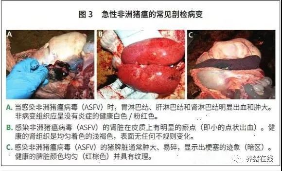 8、非洲猪瘟通常是先出现体温升高,后出现其它症状,而猪瘟则是隨着体温升高,几乎同时出现其它症状,此点可作为二者鉴别诊断。