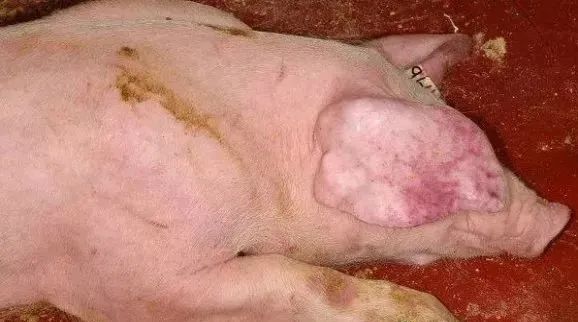 3、病猪耳、鼻、会阴、尾、脚等处呈现界线明显的紫色斑;