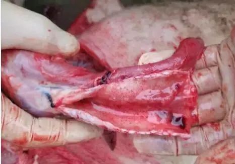 剖检病变:解剖后,在口鼻流出红色泡沫液体,气管、支气管充血,内有大量泡沫状液体。急性病例表现为耳、胸、腹下部和四肢内侧皮肤有一定数量的出血点,皮下组织广泛出血。全身淋巴结肿胀、出血。心包内积有淡黄色液体,心内膜出血,脾、肾肿大、出血。胃和小肠粘膜充血。关节腔和浆膜腔有纤维素性渗出物。