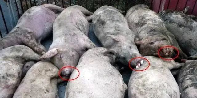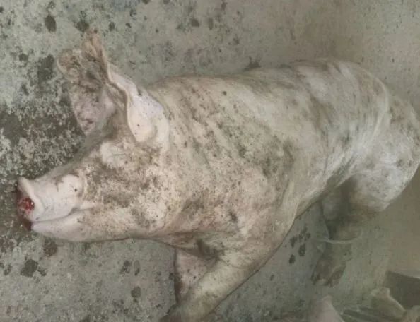 鉴别:猪急性链球菌(保育猪多发生)死亡后,虽然口鼻有血水但是比较稀薄,死亡猪只尤其是腹下皮肤呈刮痧样,有角弓反张情况。