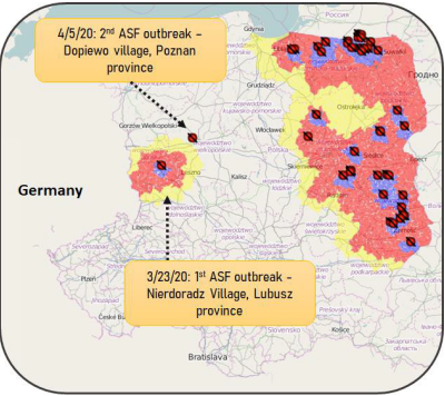 On March 23, the first ASF outbreak in a large domestic pig farm was reported in western Poland (Niedoradz), located approximately 65 km from the German border (Map 1). This marked the first outbreak on a commercial farm. Until then, ASF cases had been only identified in the area’s wild boar - including in the vicinity of the affected farm, about 2 km.