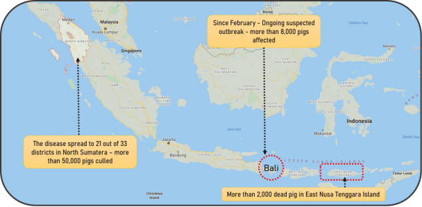 On February 5, nearly 2,804 pigs have died and 4,107 were sick in Bali from an unidentified disease. Authorities said that the symptoms exhibited by the pigs prior to their death were indicative of ASF, but has not been confirmed.