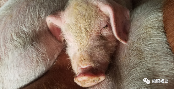 (三)虽然本场主要疾病表现在保育舍发病,仔细巡栏你会发现,在产房后期就有部分哺乳仔猪有蓝耳病的感染症状,所表现为哺乳仔猪低烧,眼睑水肿,眼分泌物增多,眼毛上有黑色物粘着,类似黑色“睫毛膏”,严重的上下眼睑黏连在一起。它们会躲进保温箱内,打堆,怕冷,精神沉郁,没有健康猪那么精神,好动,只有在母猪放乳时才出来吃奶,仔细观察你就能发现,尤其是初产母猪或胎龄低的母猪。当这些哺乳仔猪断奶混群后,很容易感染其它易感保育猪,加上保育舍环境的变化,独立开始采食固体饲料,体质弱、没免疫力的猪在40多日龄表现群体发病 。再往前看,其实在母猪怀孕阶段就能找到,部分母猪蓝耳病不稳定、排毒,到产房感染哺乳仔猪,再到断奶,所以本病的根源是要注意猪场母猪群的蓝耳病稳定,不排毒!后备母猪在初产配种前一定要充分驯化好蓝耳病,在配种前45天之前做好2次疫苗免疫接种,间隔30天,只有做好种猪群蓝耳病的稳定,产房、保育猪才好养。