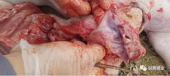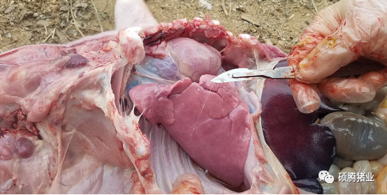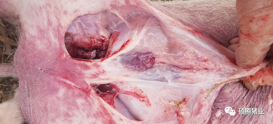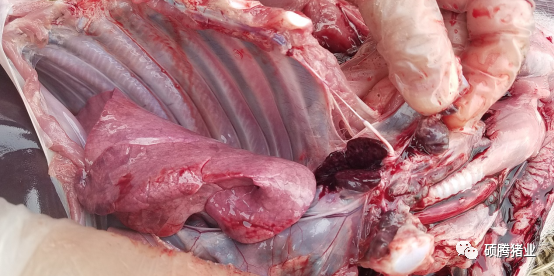 图15 胸腔有纤维素附着,肺与胸腔有少量黏连