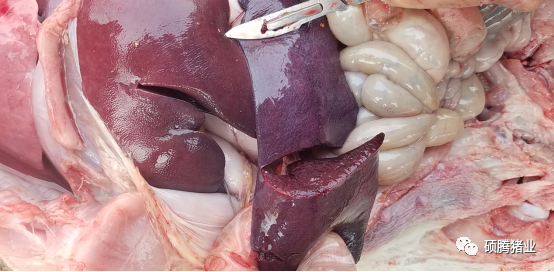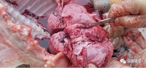 剖检症状:解剖2头死亡的保育猪,其体况良好,膘情上等。耳、腹下部、后臀部发绀(图5),眼睑分泌物增多、黏连(图6),鼻孔未见明显分泌物(图11),颌下淋巴结、腹股沟淋巴结出血、淤血发绀,胸腔入口淋巴结出血严重、肿大(图7、9、12、13);扁桃体淤血发绀(图10), 肺脏质地变硬,呈红褐色(图8、15),细支气管内有多量粘性分泌物(图16),肾脏浆膜有充、出血(图17),脾脏肿胀,刮过量多(图18),肝脏淤血,胆囊充盈,胃内空虚,小肠、大肠充满气体,膀胱未见明显眼观病理变化。
