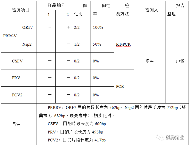 实验室检测:取以上两头死猪全身淋巴结、肺脏、扁桃体、脾脏、肾脏等合成一个样,标号为1;又急宰了2头保育猪活猪,取了以上病料,合成一个样,标号为2。送到硕腾北京实验室进行蓝耳病、猪瘟、伪狂犬、圆环的PCR检测。检测结果见表1: