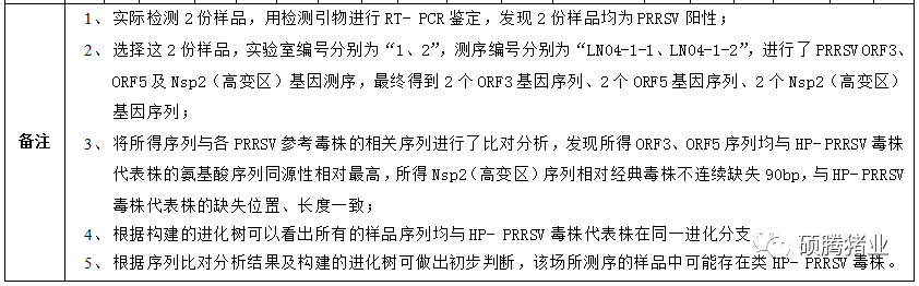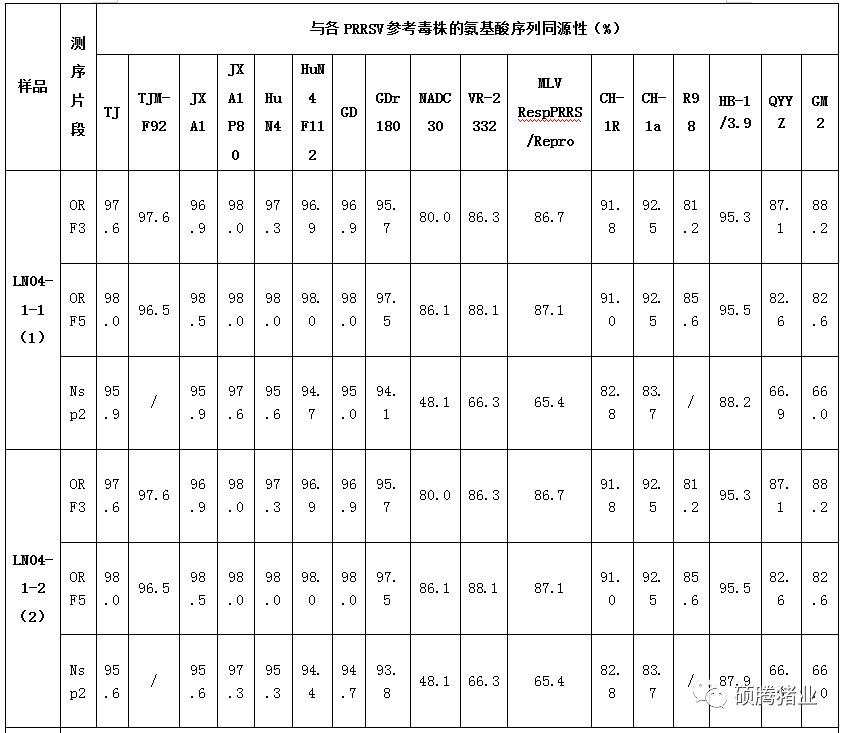 根据保育猪的临床症状、病料剖检、实验室检测进行综合诊断,认为本场保育猪为蓝耳病感染为主,后继发细菌感染,因为饲料、饮水中使用了抗生素,使用猪表现较为轻微细菌感染,本场的主要问题是蓝耳病综合防控不理想。在PCR检测中,死亡的保育猪中有Nsp2缺失的高致病性蓝耳病病毒(HP-PRRSV)呈阳性,为了确认蓝耳病病毒的详细基因分型,后又进行基因测序,结果见表2: