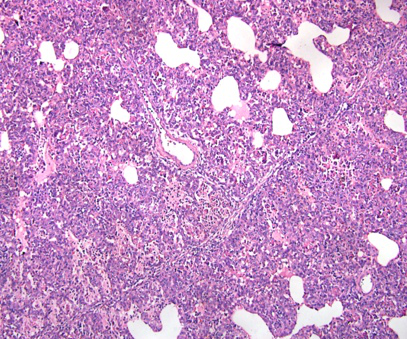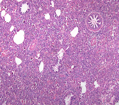 中图和右图,严重的间质性肺炎也基本可以认为是蓝耳引起的,虽然间质性肺炎意味着病毒性疾病,但是别的别的病毒性疾病可能很难引起这种典型病变