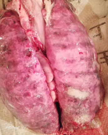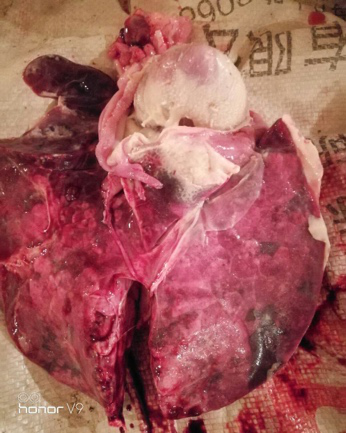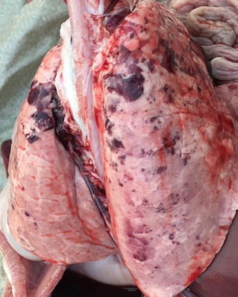 发病状态下的蓝耳总能看到典型的间质性肺炎,虽然间质性肺炎意味着病毒性疾病,但是更多的可能是蓝耳,很多疾病和血管有密切关系,蓝耳病毒具有嗜肺性特点,肺作为机体最大的毛细血管网,可以很好的衡量疾病的感染压力和发病程度,这种形态的肺,预示着猪场有严重的病毒感染压力。大体解剖中,间质性肺炎的特点是肺立体感增强,不塌陷,由于肺泡壁增生而会导致整个肺体积在胸腔内异常增大,因此典型的间质性肺炎有时候会看到特征性的肋骨压痕。