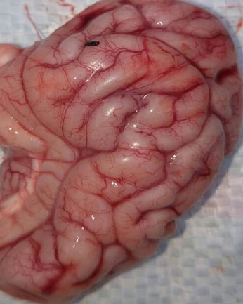 左图为为大脑的大体病变,但是大体解剖判断脑膜炎精确度不是很高,只有很严重的时候才能看出来。正常的时候,血管能够看得很清楚,如果脑膜炎严重的时候,血管周围可以看到很模糊的炎症产物,脑膜因此透明度减低和增厚