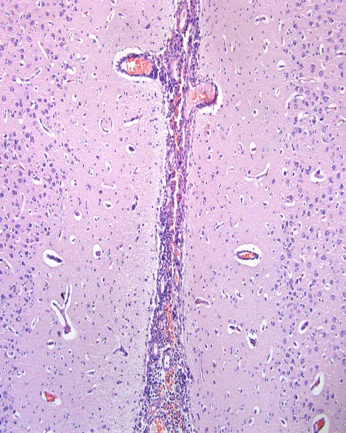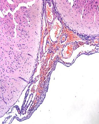 中、右图显微病变为慢性脑膜脑炎,脑膜有大量以淋巴细胞为主的混合炎症细胞,随着病程的发展,链球菌释放的毒素会破坏毛细血管,细菌随着血液循环进入大脑深皮层,形成血管套管现象,这时候的脑部显微病变和猪瘟,伪狂犬引起的病毒性脑病时很类似的。所以猪会有颤抖,摇头等神经症状