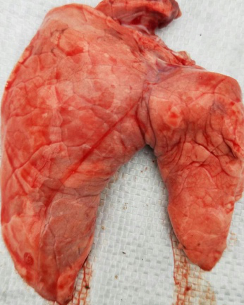 蓝耳感染早期肺形态图片,左面图基本可以认为是正常肺,可以很好的萎缩塌陷,右面的肺发病中晚期,这两种肺都是可以检出蓝耳病毒的,病毒感染早期有时候无法还无法形成肉眼可以鉴别诊断的临床症状,中期和晚期发病的猪的大体病变是有很重要的诊断意义,中图显微病变为轻度的间质性肺炎,显微病变可以很好的衡量发病与否