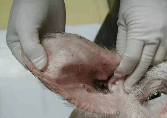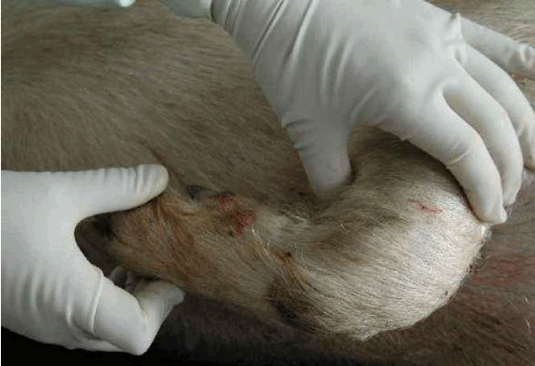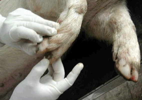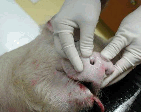 检查四肢、眼结膜的颜色、皮肤等有无异常,下颌淋巴结是否有肿胀现象等。用肉眼观察猪的外观,如皮肤,眼结膜-(苍白---附红细胞,黄疸—败血症---链球菌,猪瘟,付猪嗜血),粪(大便中有粘膜---可能是猪瘟) ,尿(血尿—衣原体,钩端螺旋体),口腔,耳朵(耳朵边上卷---弓形体),鼻腔,腹股沟淋巴结(肿大至3-5倍---圆环病),蹄部。