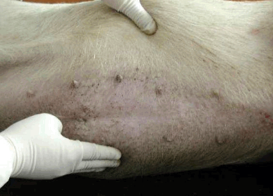 还有,亚急性猪丹毒时,或见到皮肤大小比较一致的方形、菱形或圆形疹块;急性猪瘟,皮肤多有密集的或散在的出血点(或淤血点);口蹄疫时四肢、口腔有水疱;
