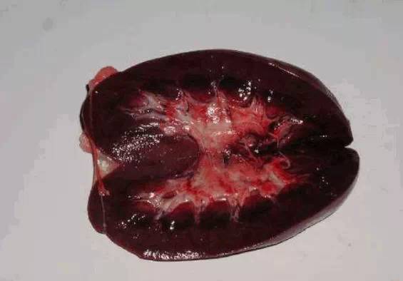 肾:两个肾先做比较,看大小是否一样有无肿胀、肿大。剖去肾包膜看肾脏表面有无针尖样出血点、苍白,水肿,瘀血。然后将肾平放横切后观察肾盂、肾盏有无肿大、出血等。如有针尖样出血点,多怀疑是猪瘟或弓形体,如斑块样出血,是链球菌。如有水肿,可能是肾炎或中毒性疾病。