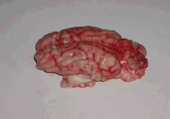 清除头部皮肤和肌肉,先在两侧眶上突后缘作一横锯线,从此锯线两端经额骨、顶骨侧面至枕嵴外缘作二平行的锯线,再从枕骨大孔两侧作一"V"形锯线与二纵线相连。此时将头的鼻端向下立起,用槌敲击枕嵴,即可揭开颅顶,露出颅腔。看有无出血点、萎缩、坏死现象。