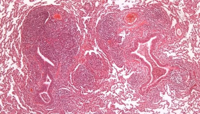 大部分多杀性巴氏杆菌毒株为继发性病原,引起纤维素性支气管肺炎到卡他性化脓性支气管肺炎等不同病变。在纤维素性支气管性肺炎中,肺泡内产生纤维素性渗出物,同时在胸膜表面也有纤维素性渗出物。另外由于血栓的形成,导致肺脏出现多个缺血性灶。在卡他性化脓性支气管肺炎中,呼吸道内(气管、支气管和细支气管)和肺泡腔内有粘液性分泌物或者卡他性脓性分泌物(图4)。另外一个同样能引起支气管性肺炎的病原为支气管败血波氏杆菌,尤其是1周龄仔猪,发病时会伴随着非渐进性萎缩性鼻炎。