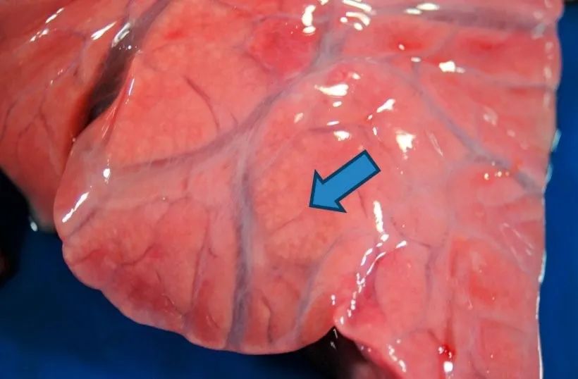 急性发病后,APP通过血源性传播发展为慢性形式,整个肺脏上散布白色点状病变。