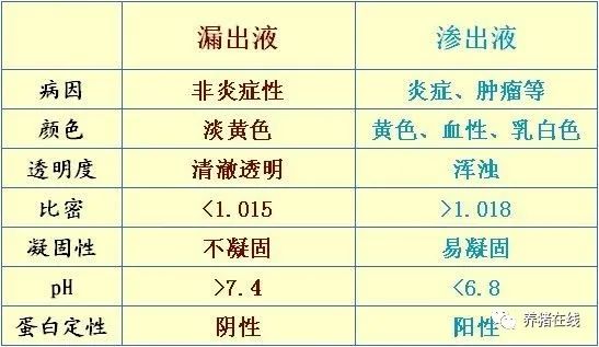 渗出液与漏出液的区别:渗出液多由炎症或物理、化学刺激所致,外观为血性、脓性、乳糜性等,多浑浊,比重高于1.018,能自凝,可找到病原菌;漏出液非炎症所致,外观淡黄色浆液性,多透明,比重低于1.015,不能自凝固,细菌学检测阴性。