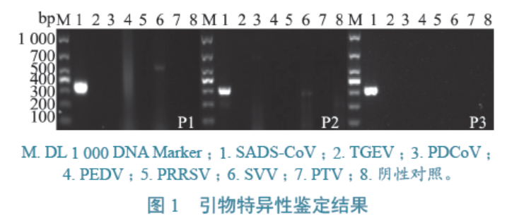 用MEG6.0对GenBank收录的12条SADS-CoV全基因组序列进行比对,根据其保守区域N基因,用Primer 5.0软件设计3对特异引物P1、P2、P3(表1)。以SADS-CoV、TGEV、PDCoV、PEDV、PRRSV、SVV和PTV等病毒的cDNA为模板,分别用上述3对引物在同等条件下进行PCR扩增,从中选出特异性强、扩增效率高的引物,用于SADS-CoV RT-PCR检测方法的建立。