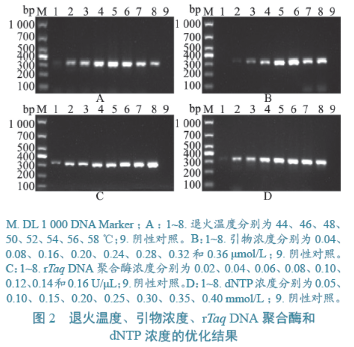dNTPs浓度优化。通道5~8均拥有相等亮度的目标条带(图2-D),因此确定最佳dNTPs浓度为0.25mmol/L。