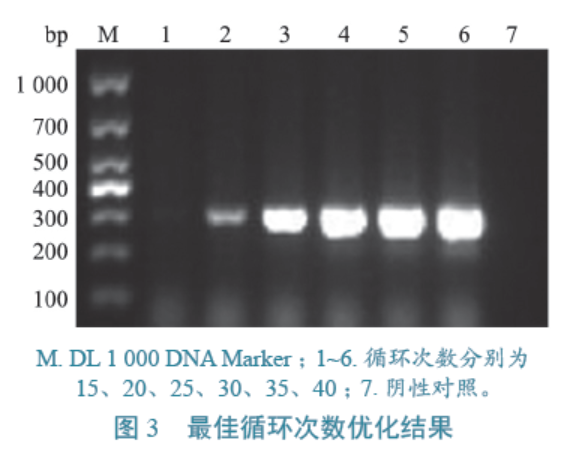 循环次数优化。设置15、20、25、30、35、40共6个循环次数梯度,应用上述优化后反应条件分别进行PCR扩增,确立最佳循环次数。