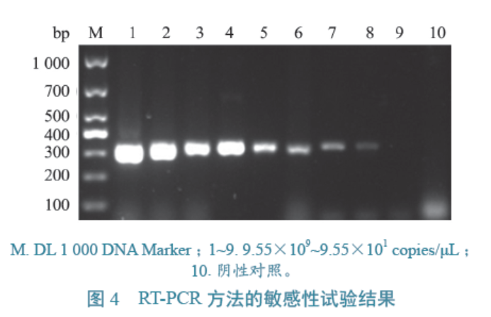测定重组质粒浓度并换算成拷贝数,对其进行10倍系列稀释后,分别作为模板,利用优化后的RT-PCR进行扩增,确定该方法的敏感性。