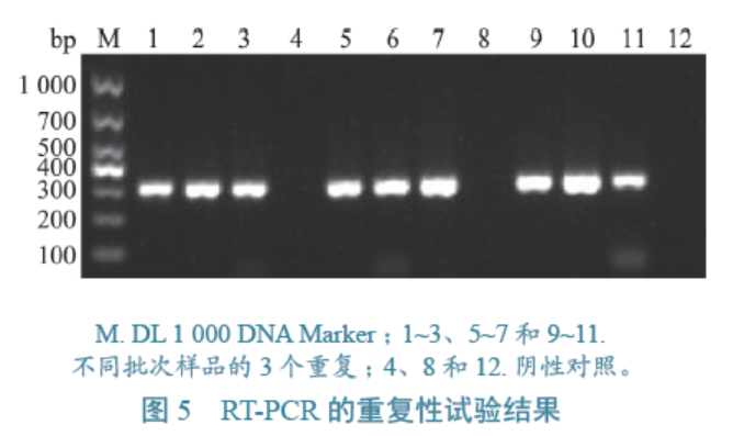 分别提取不同批次的3个阳性样品,每个样品3个重复,进行3次重复测定,验证RT-PCR的可靠性。