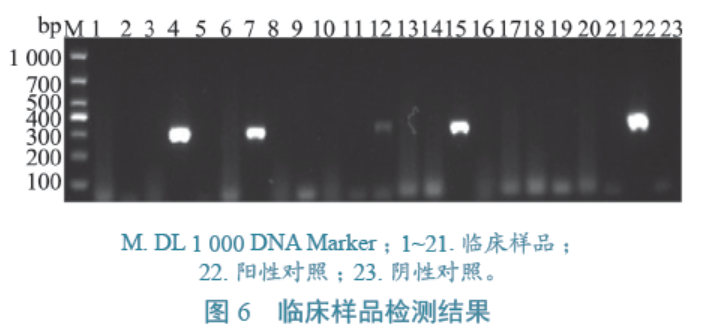 将21份临床样品进行RNA提取后反转录为cDNA,再用RT-PCR方法进行检测,检测结果(图6)显示阳性4份、阴性17份,阳性率为19.05%(4/21)。将SADS-CoV阳性样本的扩增产物进行测序,证实目的条带均为SADS-CoV N基因的特异性片段。测序分析结果和RT-PCR结果完全一致,进一步验证了建立的RT-PCR检测方法的特异性和准确性。