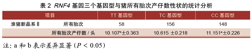 2.3猪RNF4基因三个基因型与猪所有胎次产仔数性状的关联分析