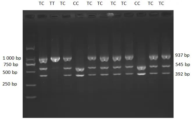 当多态位点为TC基因型时,可见3个片段(937 bp+545 bp+392 bp);当多态位点为TT基因型时,可见一个片段(937 bp)(图1)。