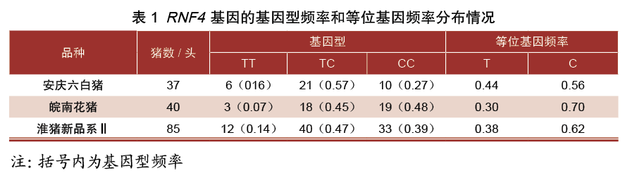 2.2猪RNF4基因的基因型和等位基因的频率分布