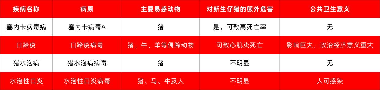 因此,任何猪场一旦出现类似口蹄疫的水疱性症状,必须立即进入最高警戒状态。下表清晰地展示了SVA与其他几种重要水疱性疾病的鉴别要点: