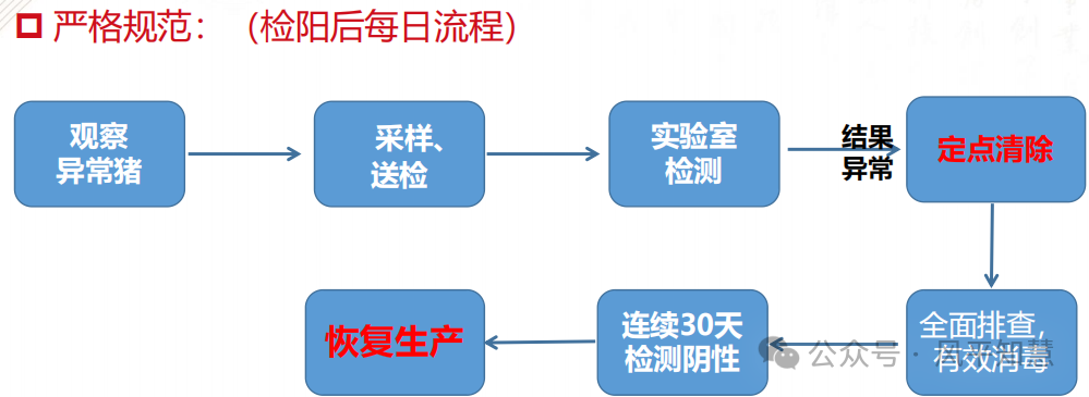 舍内操作:日常规范饲喂、输精等;检阳后立即处理病死猪、消毒环境,并采样验证。
