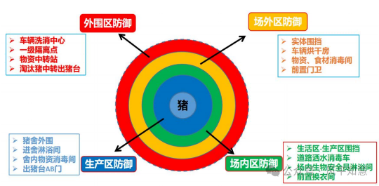 包括外围区防御(如车辆洗消中心、物资中转站)、场外区防御(如实体围挡、烘干房)、场内区防御(如淋浴间、消毒间)和生产区防御(如出猪台AB门)。