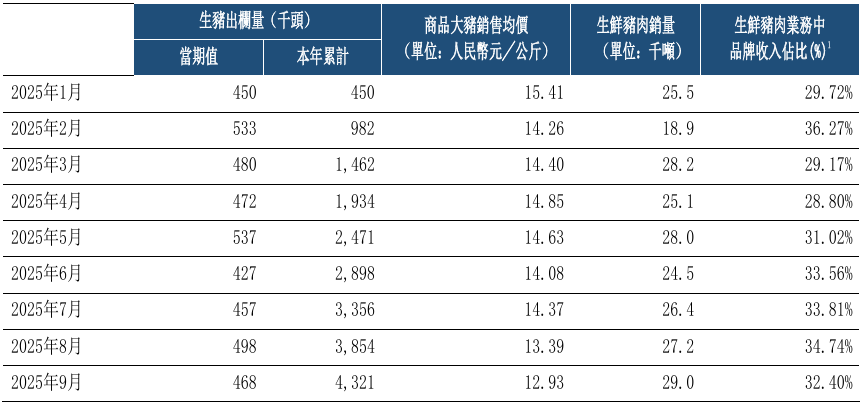 10月14日,中粮家佳康(01610)发布公告,2025年9月的主要运营数据(未经审核)显示,生猪出栏量为47万头,商品大猪销售均价为12.93元/公斤,生鲜猪肉销量为3万吨,生鲜猪肉业务中品牌收入占比为32.40%。截至2025年9月,累计生猪出栏量为432万头。